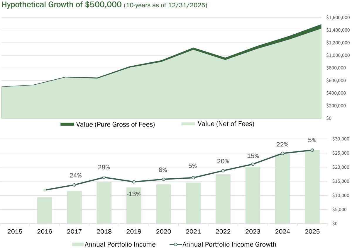 Analyzing the DAC Equity strategy’s performance over the past decade demonstrates how both outcomes can be achieved through a single investment approach. The mountain chart below illustrates how a $500,000 investment in the representative DAC Equity portfolio as of December 31, 2015, grew to $1,490,631 ($1,426,565 net of DAC’s management fee) over a 10-year period. The bar chart below illustrates the increase in annual portfolio income from $9,319 to $26,072 over the same period, representing an average annual growth rate of 12.3%.