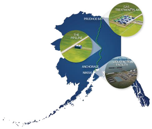 When completed, it will be among the world’s largest natural gas development projects, consisting of gas treatment facilities in Prudhoe Bay, an approximately 800-mile, 42-inch-diameter pipeline to Southcentral Alaska – with several offtakes (or connections) for in-state use – and an LNG export facility in Nikiski, AK.